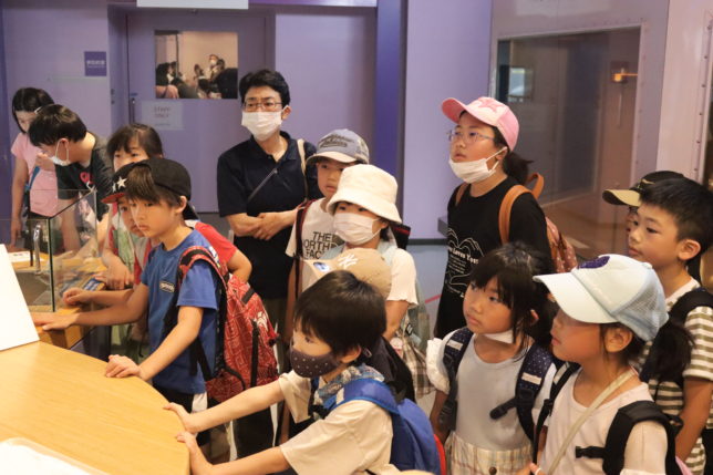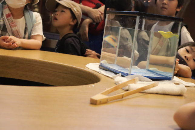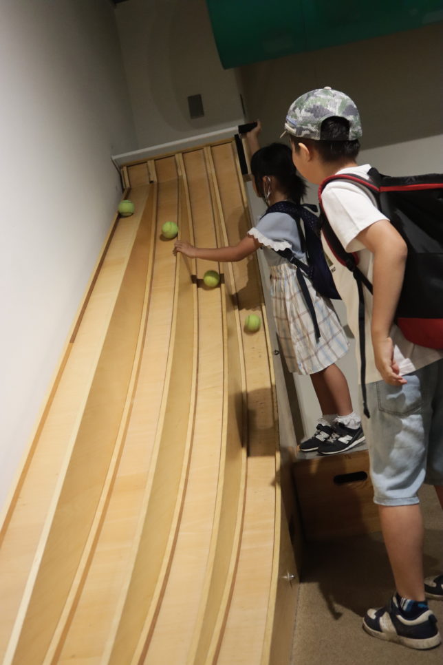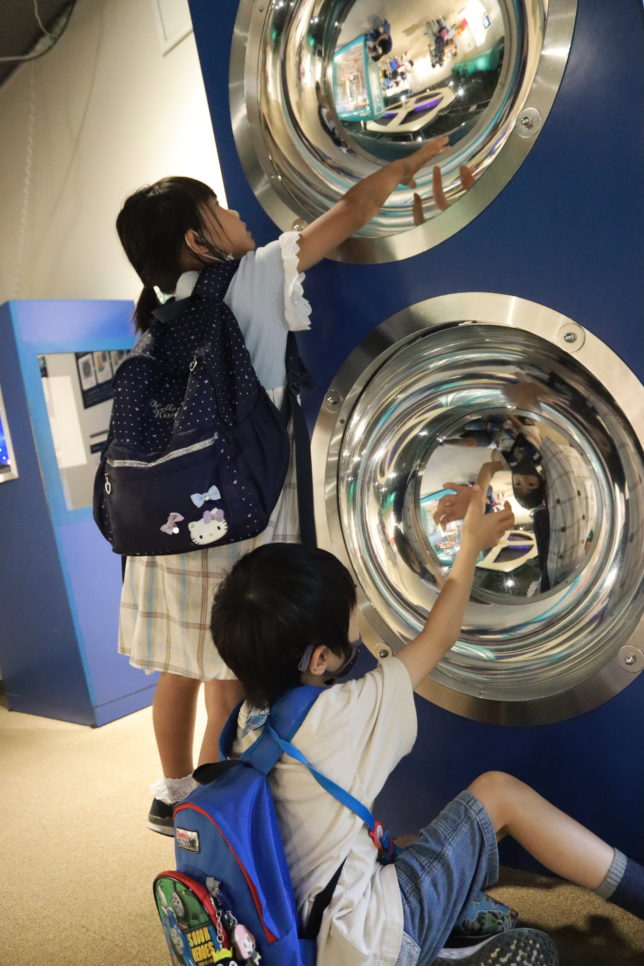 入館して最初に見学したのは、ミニ実験「うくの?しずむの?水パワー」でした。同じ大きさの球体でも水に浮くものと沈むものがあります。実験結果から浮力とアルキメデスの原理について教えてもらいました。子どもたちの真剣なまなざしが印象的でした。