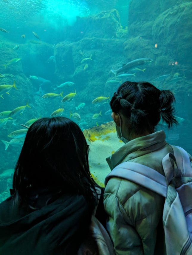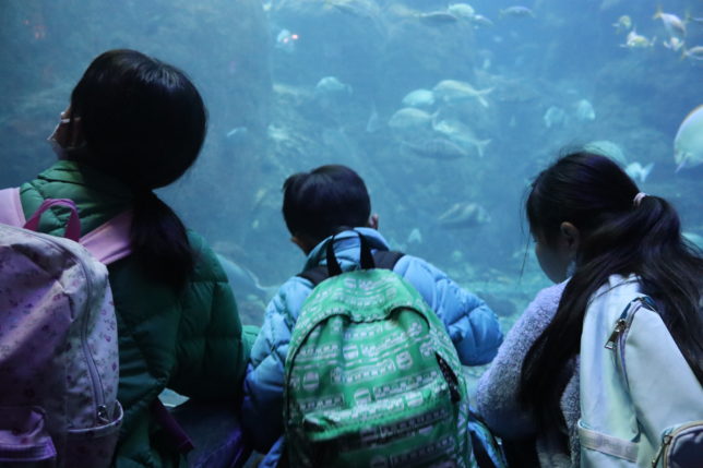 到着は予定より少し遅くなりましたが、営業開始時間から少し遅れて団体の切符を購入して入場しました。魚たちが泳ぎ回る大きな水槽にくぎ付けになったり、数々の展示を思い思いに楽しんでいました。昼食の後は、ペンギンさんのお食事やウミガメの展示、カピバラなどいくつものグループで堪能していました。
