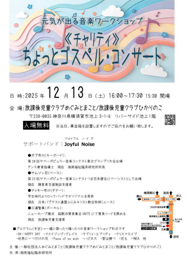 12月13日の16:00から17:30の時間帯で、「めぐみとまこと」と「ひかりのこ」を会場としてチャリティ・コンサートを企画しています。入場は無料ですが、「めぐみとまこと」と「ひかりのこ」の2つのクラブの継続的な運営の支援を目的として募金箱を設置します。当日の寄付金はクラブの運営のための費用に充てられます。是非、ご協力ください。