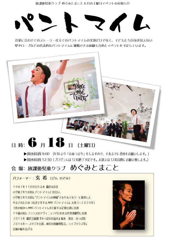 6月の行事日:パントマイム 2022年5月22日 / megumitomakoto / コメントする 今年度最初の行事日はパントマイムのパフォーマンスと実際に自分たちでパントマイムに挑戦してみるパントマイム体験をします。