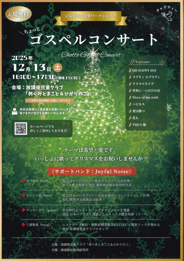 「めぐみとまこと」と「ひかりのこ」の2つの学童クラブの運営継続を願って、クリスマスのシーズンにチャリティ・コンサートを企画しました。入場は無料ですが、当日会場内に募金箱を設置しますので是非ご協力ください。